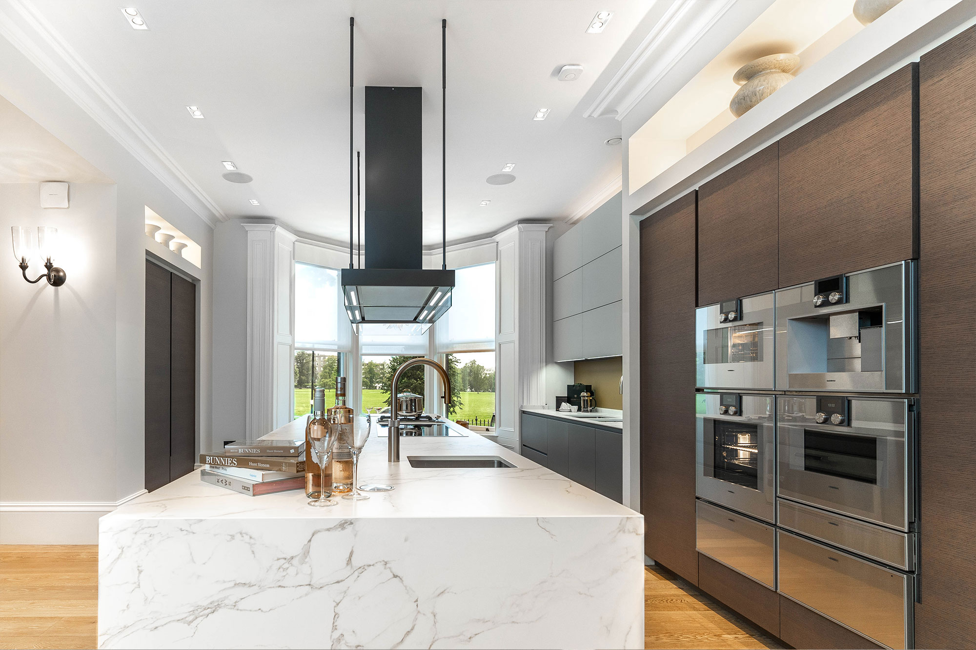 MODERN CULINARY EXPERIENCE The Poliform Shape kitchen features black elm tall units complemented by a metal lacquered island. A bespoke tall goal post surround houses a practical breakfast unit and an integrated Gaggenau fridge freezer, giving our clients a modern culinary experience.